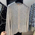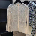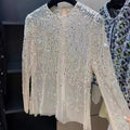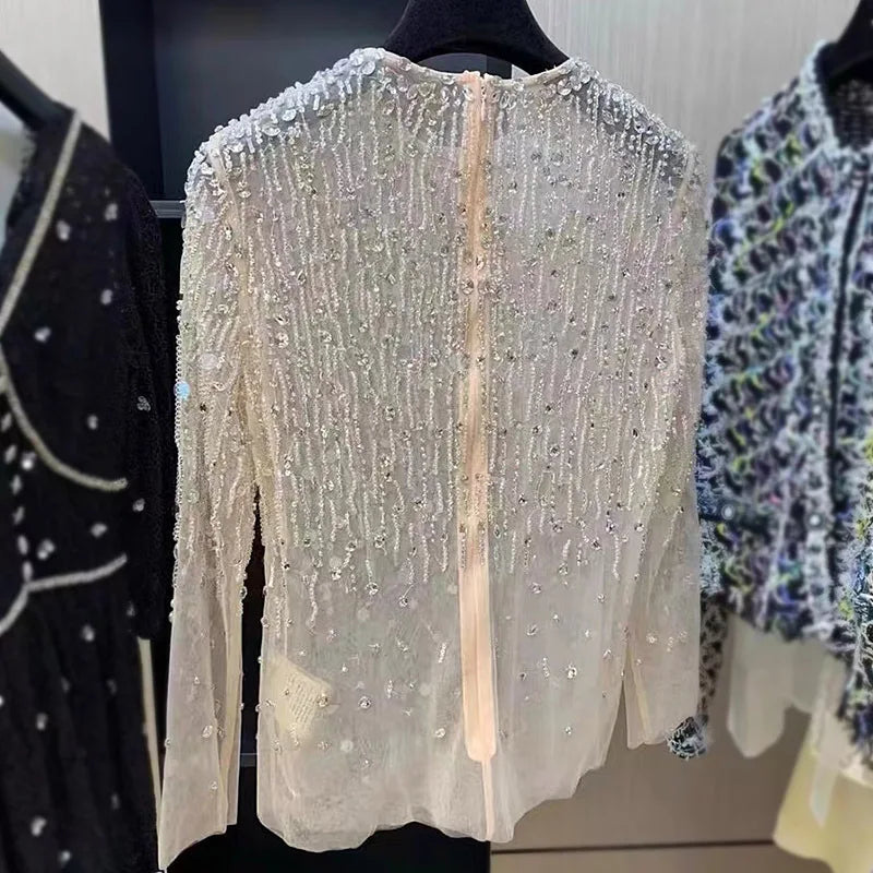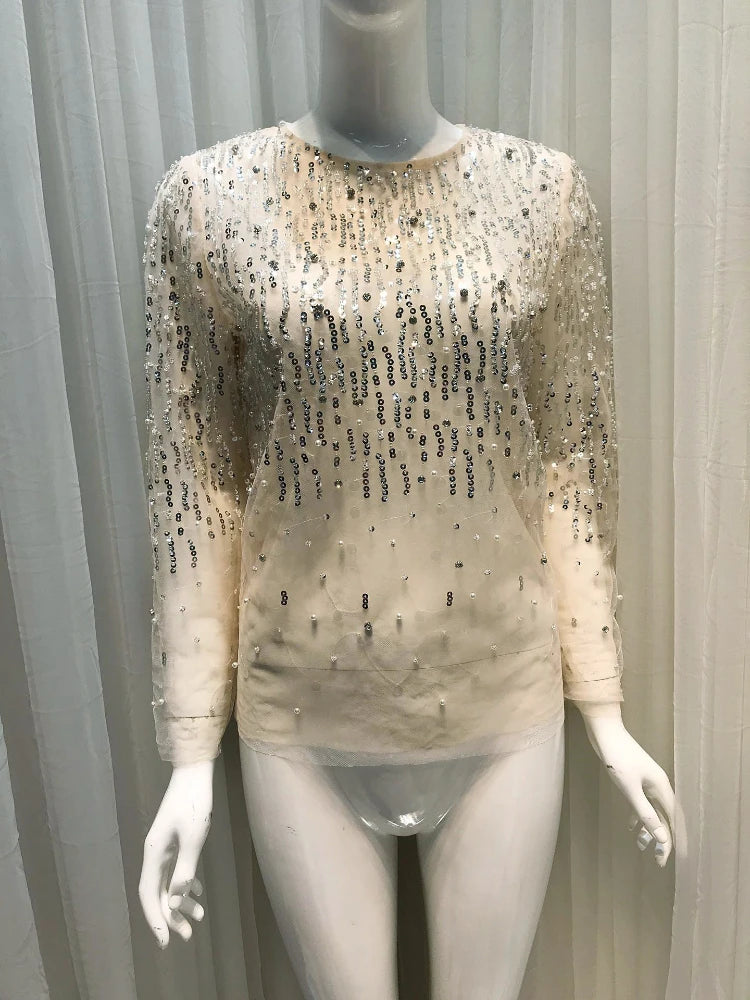 The "Diamond Glow" Blouse is your key piece from the Spring 2025 Collection. Developed with sensual Gauze Mesh and Diamond Sequin Embellishments, it ensures you capture the light and every gaze, transforming you into the star of the night.