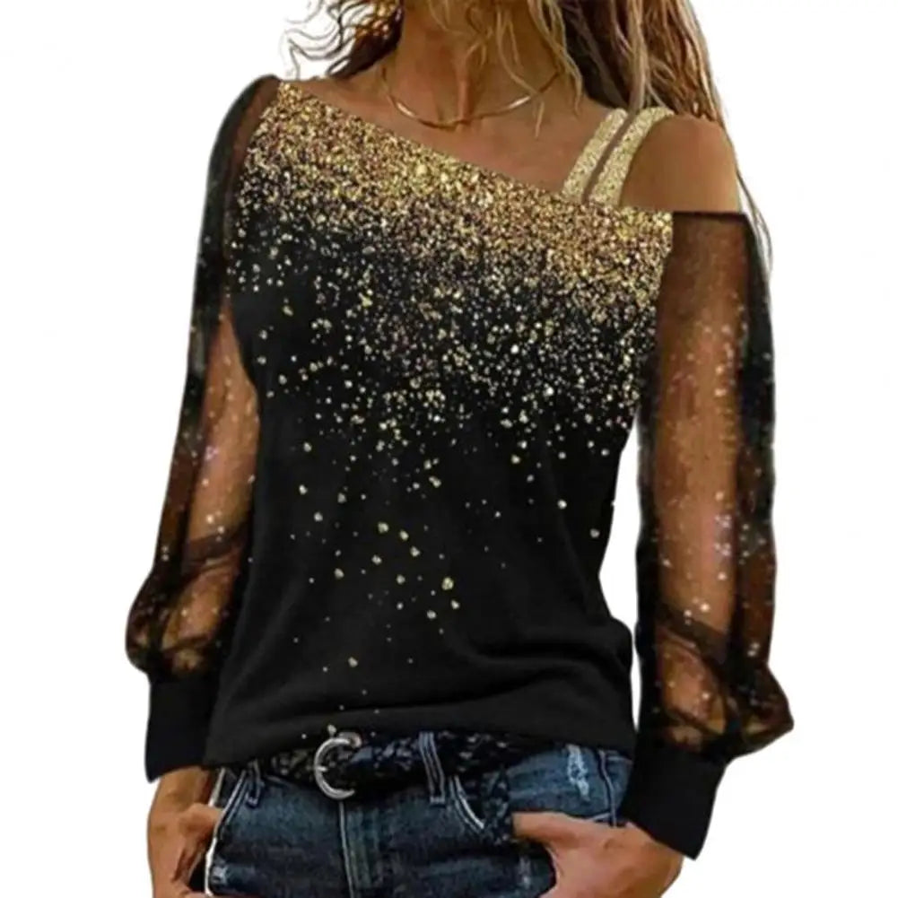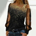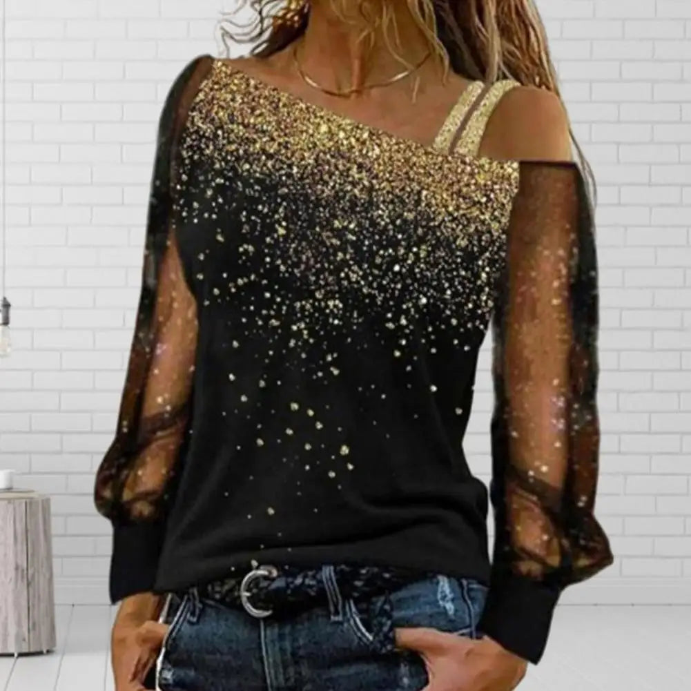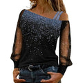 Introducing the "Fusion Glam" Top: the Spring/Fall blouse that is a true design spectacle. This Long Sleeve piece features an innovative Patchwork Design that merges the sensuality of See-through Mesh with the dazzling sparkle of Shiny Sequins. The One Shoulder/Slant Neck adds a touch of modernity and elegance, while the Polyester/Spandex fabric (91%-95% content) ensures soft, stretchy comfort, ideal for the middle-aged woman seeking style and well-being in all seasons.